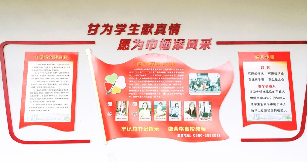 海洋旅游学院学生管理岗用“四叶草”作为创建省级巾帼文明岗的标志。四叶草的图形整体象征着岗员与学生相遇相聚相知; 一叶代表希望,二叶代表付出,三叶代表进步,而稀有的四叶草,第四片叶子象征着岗员陪伴学生一起幸福地成长。四片叶子着四种不同的颜色,它代表着该岗的工作精神:专业、高效、热情、可信。四片叶子同心汇聚、协同合作,努力将该岗品牌效应转化为实效的服务意识,时刻提醒着每位岗员在工作中严于律己,培养团队精神,为切实提高学生满意度而共同努力。