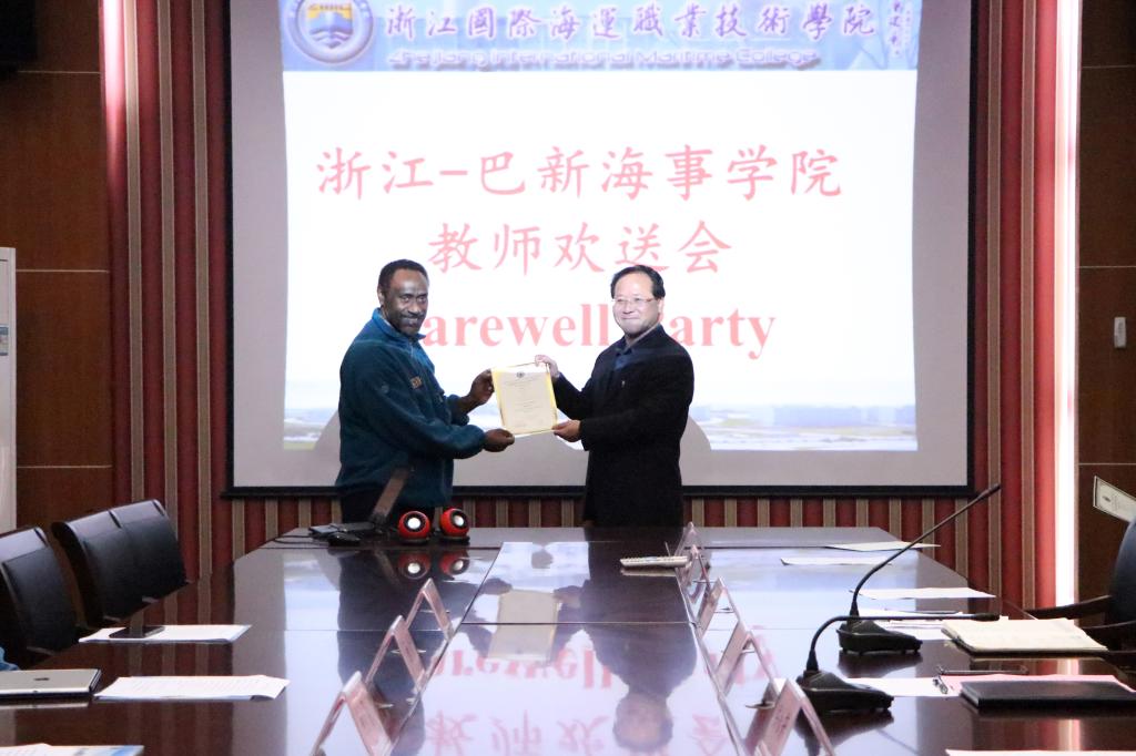 会上,孔志光副校长代表学校对三位巴新教师在我校顺利完成培训学习工作表示衷心祝贺,对三位教师的认真学习情况表示肯定,并向他们颁发了培训证书和赠送礼物。同时,孔志光副校长对航海工程学院为此次培训所做的工作表示感谢,他说,这次师资培训是浙江-巴新国际海事学院工作的第一步,接下来,将按照双方的协议计划安排,积极推进巴新学生来校培训等工作,希望3位教师回国后成为浙江-巴新国际海事学院的中坚力量,为学院发展发挥更大的作用。