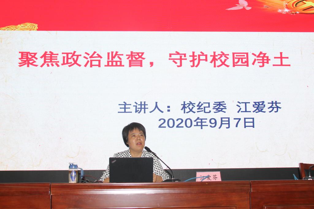 党委委员、纪委书记江爱芬作《聚焦政治监督,守护校园净土》专题讲座,结合上级纪委有关文件精神和典型案例讲解,对落实全面从严治党要求、从严管理监督干部,建设“清廉海运”提出了要求。