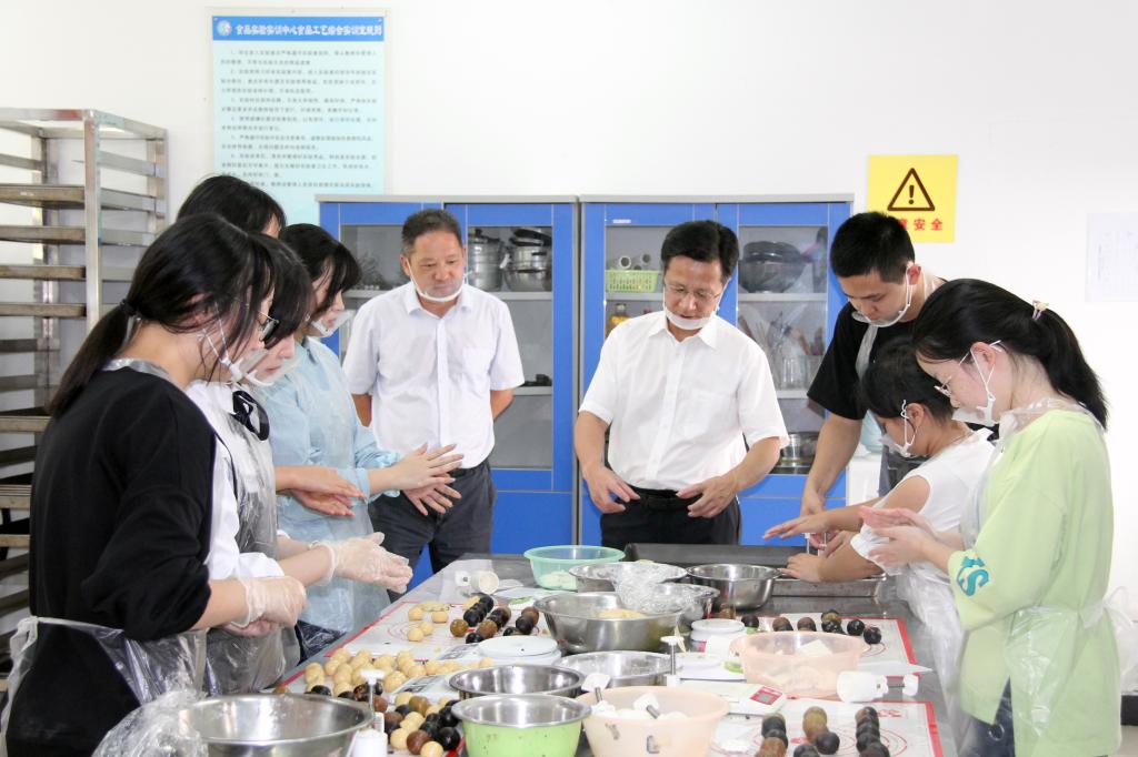 下午1点半,10名通过海韵新青年微信平台报名参加月饼制作活动的学生正在食品工艺综合实验室进行着称重、揉皮、包馅、压膜等一系列操作,忙得不亦乐乎。不久后,一个个精美饱满的月饼胚子就呈现在大家面前,在制作过程中,校党委副书记、校长吴中平和党委委员、副校长曹志斌,党委委员、工会主席刘相前来看望慰问同学们,他们认真观看了制作过程,师生间进行了良好互动。