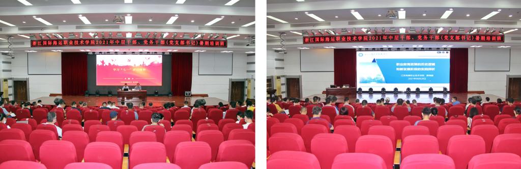 培训期间,还邀请了舟山市委党校副校长张信国作《学习“七一”讲话精神 看中国共产党的人民情怀》专题讲座。邀请江苏海事职业技术学院“双高办”主任、规划处处长黄锦鹏通过线上教学方式作《职业教育政策的历史逻辑和新发展阶段的实践探析》专题讲座。学校科研与合作处处长郭飞军、招就办主任吴平波分别就科研、招生等相关政策进行了解读。