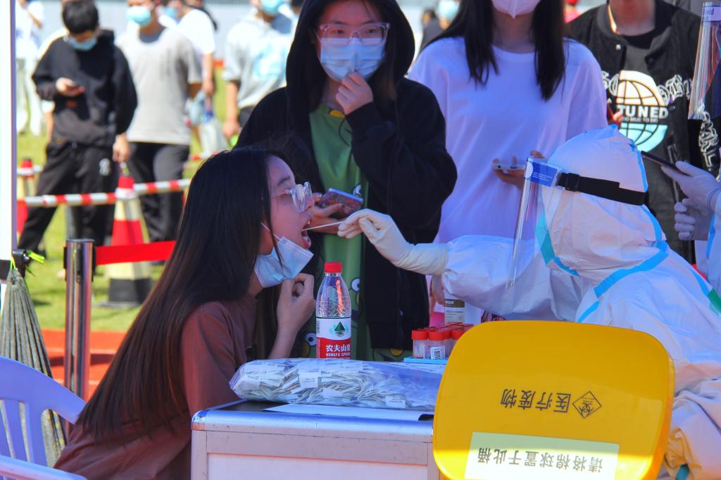 上午9时,在田径场上的11条检测通道准时开启。在校的师生员工们均佩戴口罩,间隔一米,按所在部门、学院,分时间段、分批有序进入核酸采样点。志愿者师生们有序引导,仔细核对身份信息,信息登记确认后,医务人员严格按照采样流程进行操作,整个过程有条不紊,秩序井然。
