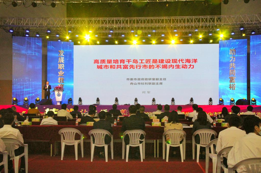 现场,中共舟山市委市政府政策研究室副主任、舟山市社科联副主席何军作了题为《高质量培育“千岛工匠”是建设现代海洋城市和共富先行区的不竭内生动力》的主旨报告。他从建设共富先行市是现代海洋城市的突出标识和重大任务、发展海洋经济是现代海洋城市和共富先行市的底基支撑、高质量培育千岛工匠是产业升级和群众致富的内生动力等进行了阐述,对舟山职业教育发展,千岛工匠培育,扎实推进高质量发展建设共同富裕示范区先行市提出了针对性地建议,理清了高水平建设现代海洋城市不竭内生动力。