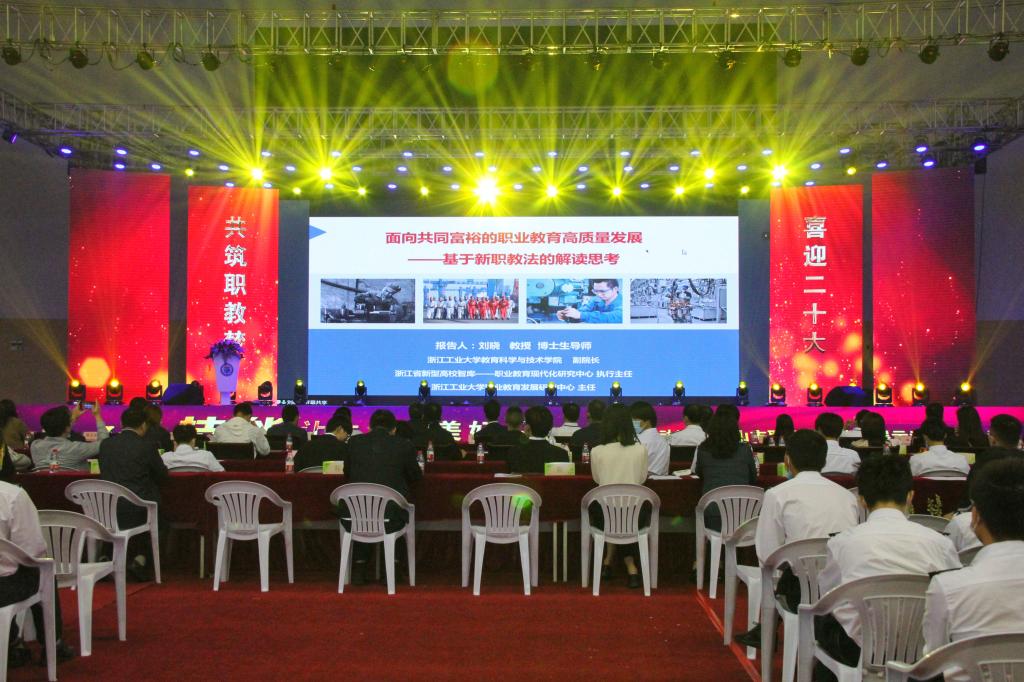 线上,浙江工业大学教授、博士生导师刘晓作了题为《面向共同富裕的职业教育高质量发展——基于新职教法的解读思考》的主旨报告。刘晓教授着重从三个方面对新修订的《职业教育法》解读和思考,从96版《职业教育法》出台的历史到新版《职业教育法》的修订过程入手,针对新版《职业教育法》内容的“创新”与“守正”提出了8点深刻见解,对浙江省职业教育改革发展进行美好的展望。刘晓教授认为,面向浙江省共同富裕示范区建设,浙江省要实现从学历社会迈向技能型社会,实现受众群体从技能谋生转向技能致富,从就业托底到充分高质量就业,从资源不平衡不充分到资源全民优质共享。职业教育要形成“全生命周期、全技能贯通、全领域覆盖、全社会认可”的现代职业教育体系,要在“高作为、高层次、高位移、高质量、高认可”的现代职业教育与治理体系新征程上努力奋斗。