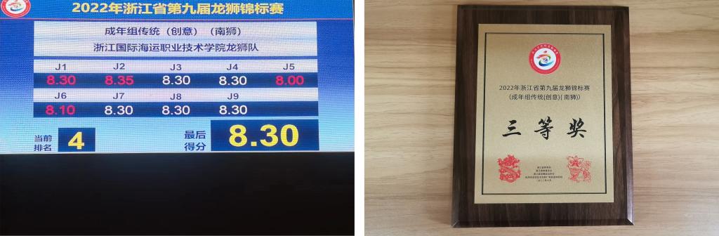 8月1日至3日,浙江省第九届龙狮锦标赛在杭州举行。我校龙狮代表队发挥出色,在激烈角逐中,夺得成年组传统(创意南狮)三等奖。这也是我校首次参加省级龙狮赛事。