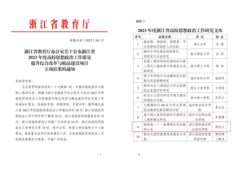 11月22日,经学校申报、资格审核、专家评审等程序,浙江省教育厅公布了2023年度高校思想政治工作质量提升综合改革和精品项目,我校马克思主义学院院长、高级政工师郑忠义主持申报的《蚂蚁岛——一座赓续红色血脉的小岛》成功入选高校思想政治工作研究文库,全省共入选10项。这是学校思政工作的一项突破,也是成立刚刚一年多的马克思主义学院的一个捷报。