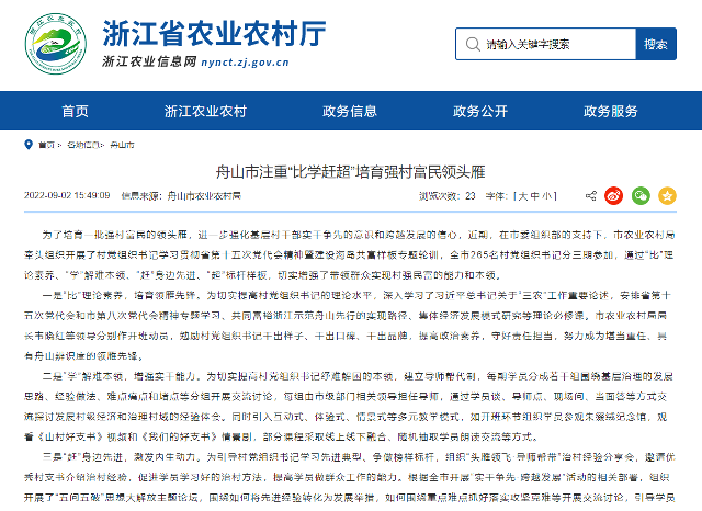 近日,从浙江省农业农村厅获悉,由舟山市乡村振兴学院承办的2022年村党组织书记学习贯彻省第十五次党代会精神暨建设海岛共富样板专题轮训项目被评定为“第一批省级农民培训促富品牌”。