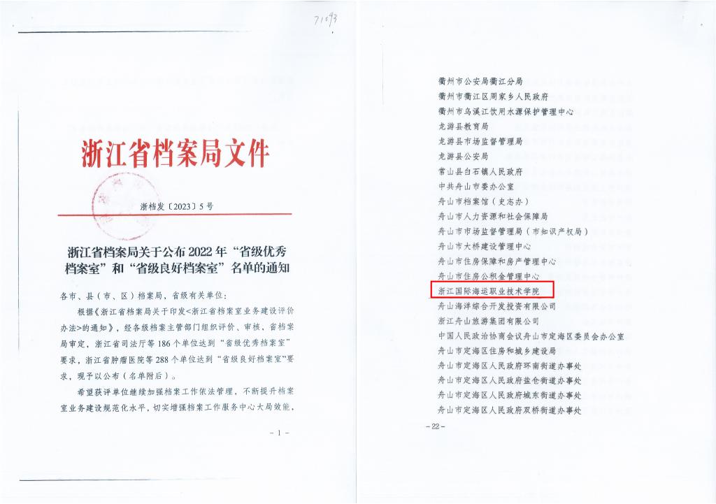 3月10日,浙江省档案局公布了2022年省级优秀档案室和省级良好档案室名单,我校被评定为省级良好档案室。这是省档案局首次在全省各级机关、团体、国有企业事业单位、行政村和社区等单位中开展档案室业务建设评价工作,全省高职院校中仅有2所学校被评定为良好等级。