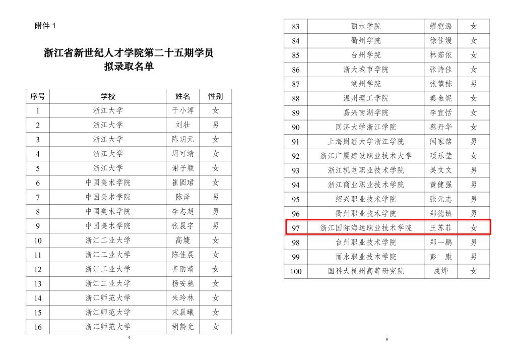 日前,第二十五期浙江省新世纪人才学院录取名单公布,我校国际教育学院王苏菲同学被成功录取。据学员名单信息显示,本期100名学员中仅7名同学来自高职院校。