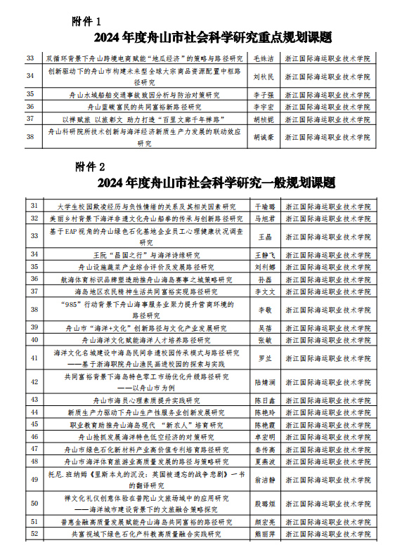 近日,舟山市社科联公布了《2024年度舟山市社会科学研究课题立项通知》。相较往年,我校今年立项比率创历史新高,申报46项共获批立项28项,立项率达到61%,其中6项为重点规划课题,22项为一般规划课题,为历年立项比率最高。