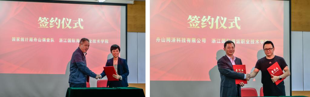 仪式上国家统计局舟山调查队、舟山同泽科技有限公司分别与学校签订了战略合作框架协议,在数据共享、人才培养等方面就此展开深度合作。