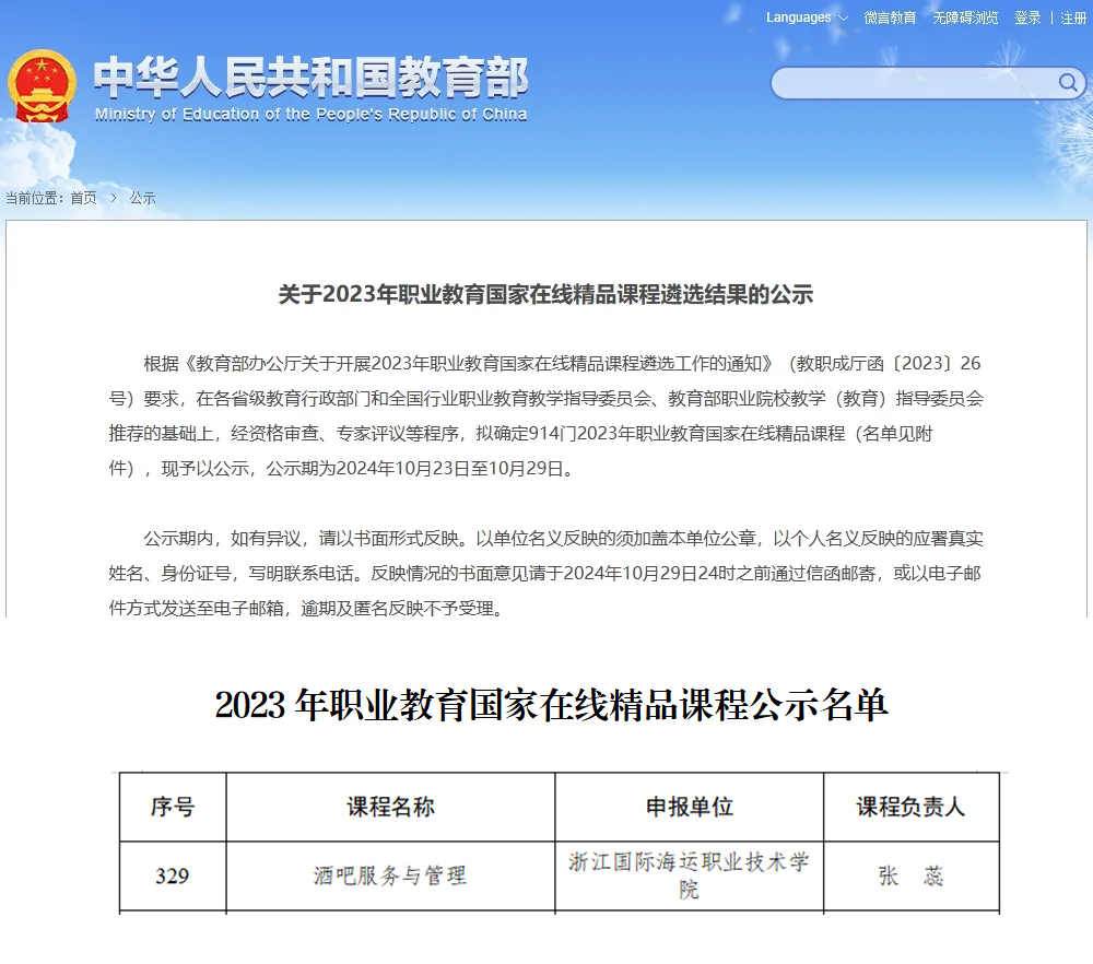 近日,教育部公示了2023年职业教育国家在线精品课程的遴选结果,我校海洋旅游学院张蕊老师负责的《酒吧服务与管理》课程获批国家在线精品课程,实现了学校课程建设新突破。