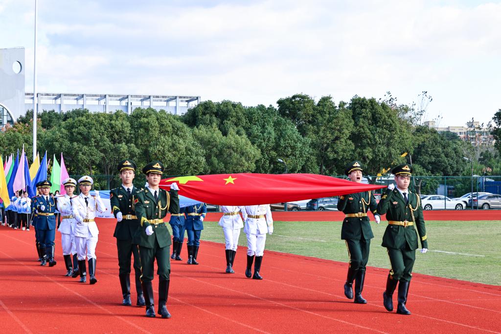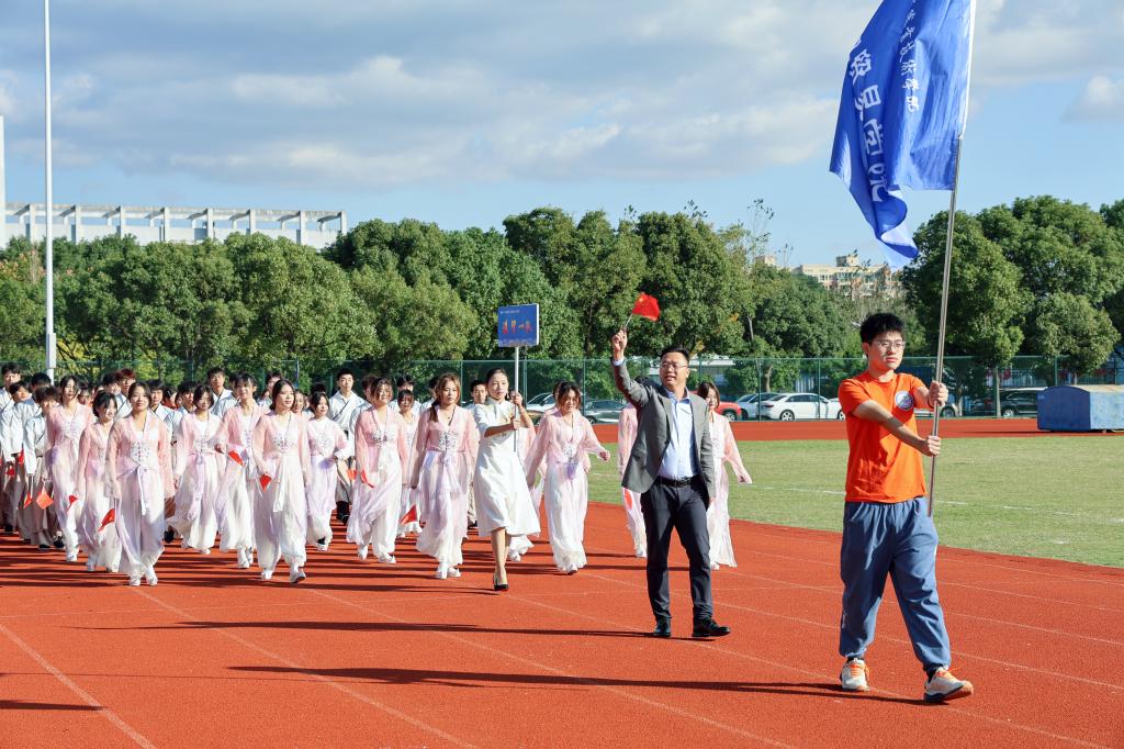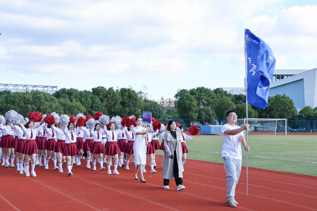 伴随着运动员进行曲,英姿飒爽的国旗护卫队、团学干部组成的彩旗队、裁判员方阵迈着整齐的步伐入场。
