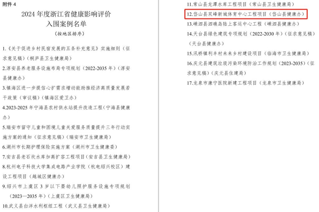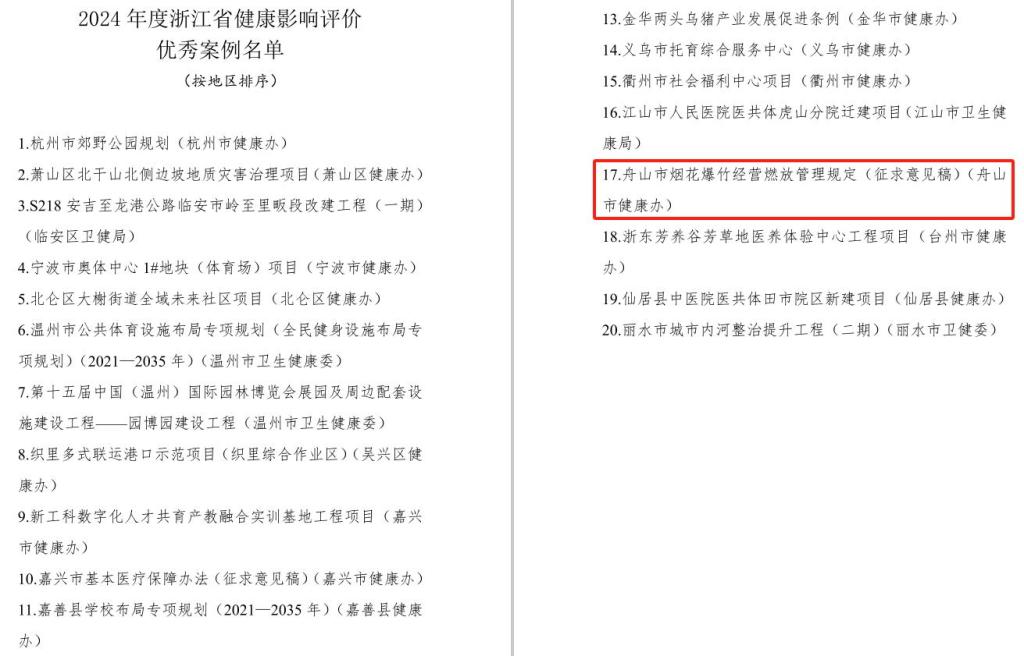 近日,省委省政府健康浙江建设领导小组办公室正式公布2024年度浙江省健康影响评价优秀案例名单。我校凭借扎实的科研实力和专业的研究水平,收获了优异成绩。由我校撰写的“舟山市烟花爆竹经营燃放管理规定(征求意见稿)”健康影响评价案例成功入选优秀案例名单,“岱山县双峰新城体育中心工程项目”健康影响评价案例入围。
