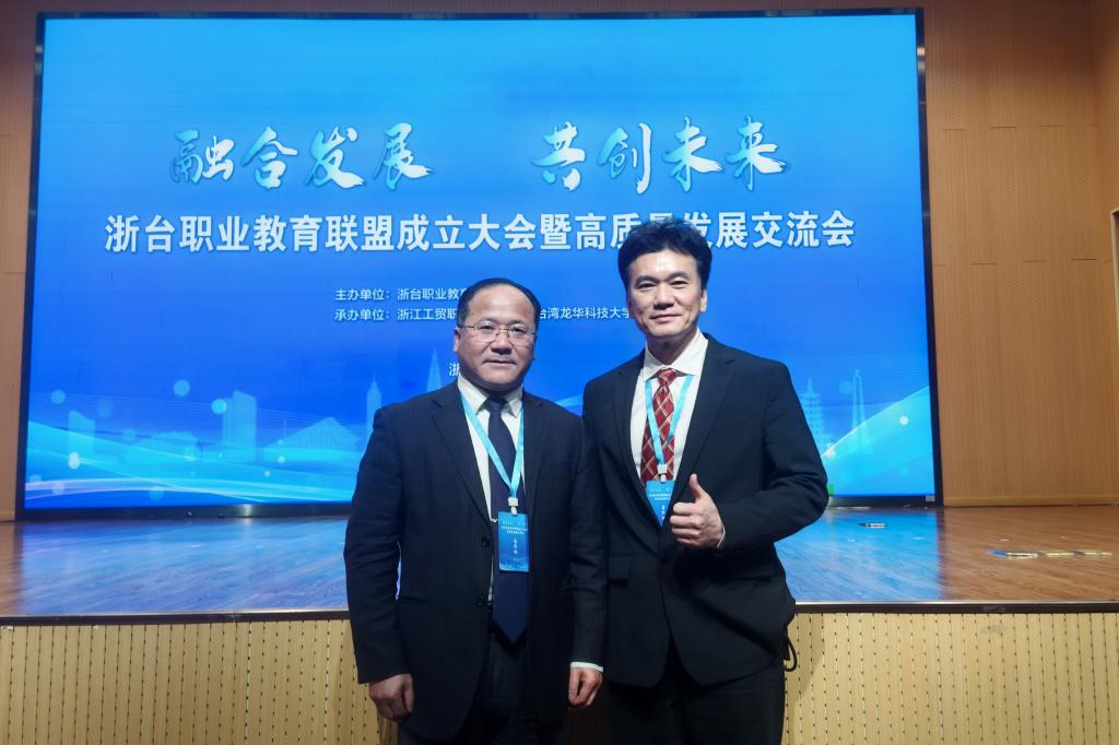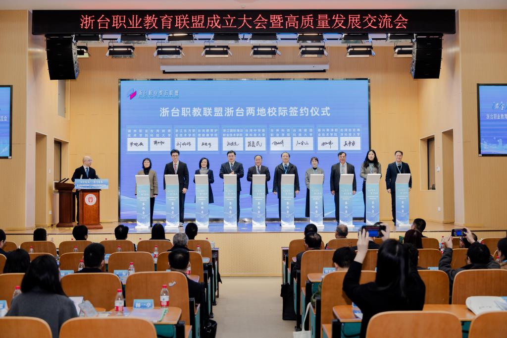 1月25日,浙台职业教育联盟成立大会暨首届浙台职业教育高质量发展交流会在浙江工贸职业技术学院举行。浙江省教育厅副厅长舒培冬,省教育厅港澳台办主任蓝晶晶,台湾私立科技大学校院协进会理事长、台湾龙华科技大学校长葛自祥以及来自台湾13所高校和浙江29所高职院校、行业协会、企业的领导、嘉宾共80余人参加。我校党委副书记孔志光率队出席,并代表学校分别与台湾龙华科技大学、台湾台北海洋科技大学、台湾树德科技大学等签订合作协议。
