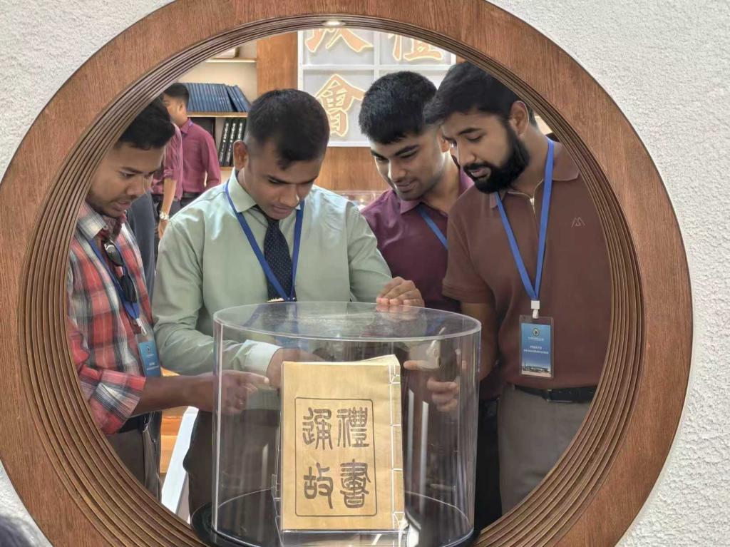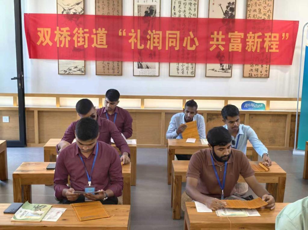 此外,学员们还参访舟山博物馆与城市馆展览,通过历史文物与城市规划模型,直观领略舟山作为“海上花园城”的发展脉络;现场观看浙BA舟山赛区篮球赛,与市民共同为球队助威,感受城市活力。培训期间,学员们与我校师生组织足球、篮球友谊赛,以体育为桥增进跨文化友谊。在舟山市定海区浙东礼学馆,学员们聆听关于浙东地区礼仪文化、儒家思想及舟山民俗的专题讲解,近距离感受中国传统文化的深厚底蕴。部分学员还亲身体验传统茶道、书法等文化活动,在工作人员指导下尝试书写汉字,体悟中国艺术的独特韵味。