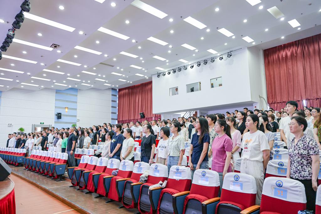 学校报告厅内,气氛庄重而热烈。数百名教师早早来到现场,等待阅兵仪式开始。当国旗冉冉升起、国歌奏响时,全体教师起立行注目礼,表达对祖国的深切热爱和崇高敬意。