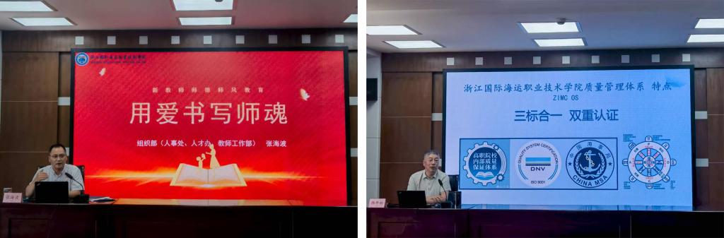 随后,各职能部门负责人依次开展专题授课:教师工作部部长张海波围绕“师德师风建设”与“绿色校园创建”进行讲解,强化新教职工的职业伦理意识与生态育人理念。质管办主任韩开封宣贯质量管理体系,帮助大家掌握教学管理的标准与流程。人事处副处长章靖详细解读人事政策,明晰教师职业成长路径。教务处副处长杨飞聚焦“课堂教学规范”与“教学基本技能”,指导提升教学设计能力。纪委办主任熊孜开展廉政教育,筑牢廉洁从教思想防线。科研处处长何琪讲解科研项目申报与经费管理要点。安保部部长陈增跃就教职工安全意识培养、电信诈骗防范及消防设备使用等进行宣讲。学工部副部长周燕解读学生管理规范。办公室副主任张龙燕围绕“法治校园”建设明确风险防范要点。后勤产业处校医金曙敏开展应急救护培训。宣传部副部长周勤介绍校园文化,加深新教职工的文化认同感。