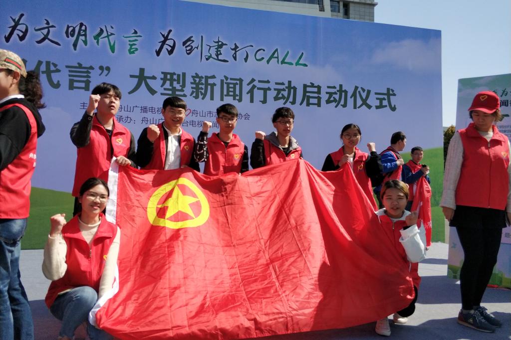 启动仪式上,志愿者们共同见证了揭牌仪式,舟山广电总台党委书记、台长颜兆祥在致辞中号召大家齐心协力、积极参与,传播文明新风,让文明有礼深入人心,让生活更美好,让城市更文明!活动最后,学院志愿者与所有志愿者一起激情昂扬的宣誓,为文明代言!