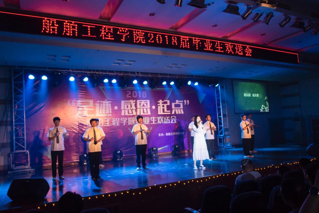 晚会在船舶工程学院全体教职工的表演《相亲相爱一家人》中拉开帷幕:第一篇章“足迹”由回顾校园生活的舞蹈、经典咏流传、情景剧、杯子舞等节目组成;第二篇章“感恩”用话剧社、动漫社、摄影社、精武社的精彩节目讲述了同学们在学院“同舟基金”感恩校园文化品牌引领下,在校内外各类活动中学会了感恩;第三篇章“(新的)起点”结合了充满希望的手语表演《追光者》、激情澎湃的朗诵《三年前》、语重心长的院长寄语等环节,回顾了大学的青春足迹,指明了未来的前进方向,表达了母校老师对毕业生的期望。晚会在各位老师和毕业生代表合唱的《毕业歌》中圆满落幕。