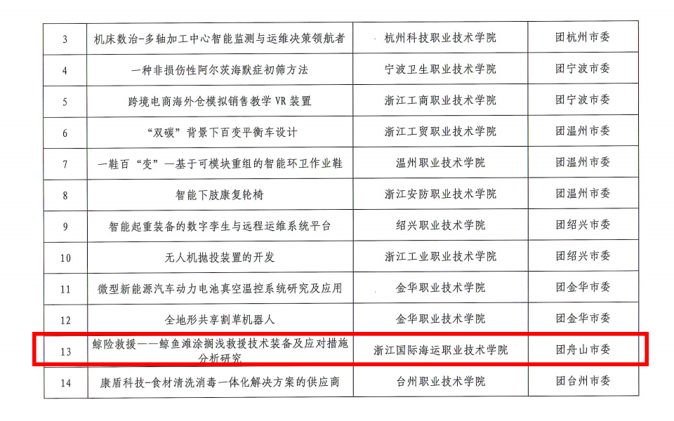 经我校及时发动,精心组织,3个项目从众多参赛项目中脱颖而出,其中《鲸险救援——鲸鱼滩涂搁浅救援技术装备及应对措施分析研究》(指导老师:徐明伟、李献丽 团队成员:郭超逸、张钰涵、徐昊鑫、章子翔、谢雨鑫)获得银奖,《基于光感应的原油脱水自动关阀便携装置》(指导老师:高良军、周师思 团队成员:丁淳、周明磊、潘佳盈、陈雪峰、王炜屹)和《一种基于新能源背景下的机械化渔船》(指导老师:董明海、赵陈 团队成员:沈逸凯、陈佳佳、蔡明、余文琪、张轩、吴杰)2项获得铜奖。