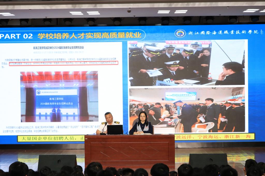 院长汪益兵介绍了学院航海教育现状,往届毕业生就业情况、考证情况,学院奖学金制度等,让家长更加了解学院的教学实力和学生的就业前景,也让学生们对自己的未来充满期待和信心,期待通过家校合力,提高学生考证通过率,促进学生高质量就业,共同托举学生迎接灿烂明天。