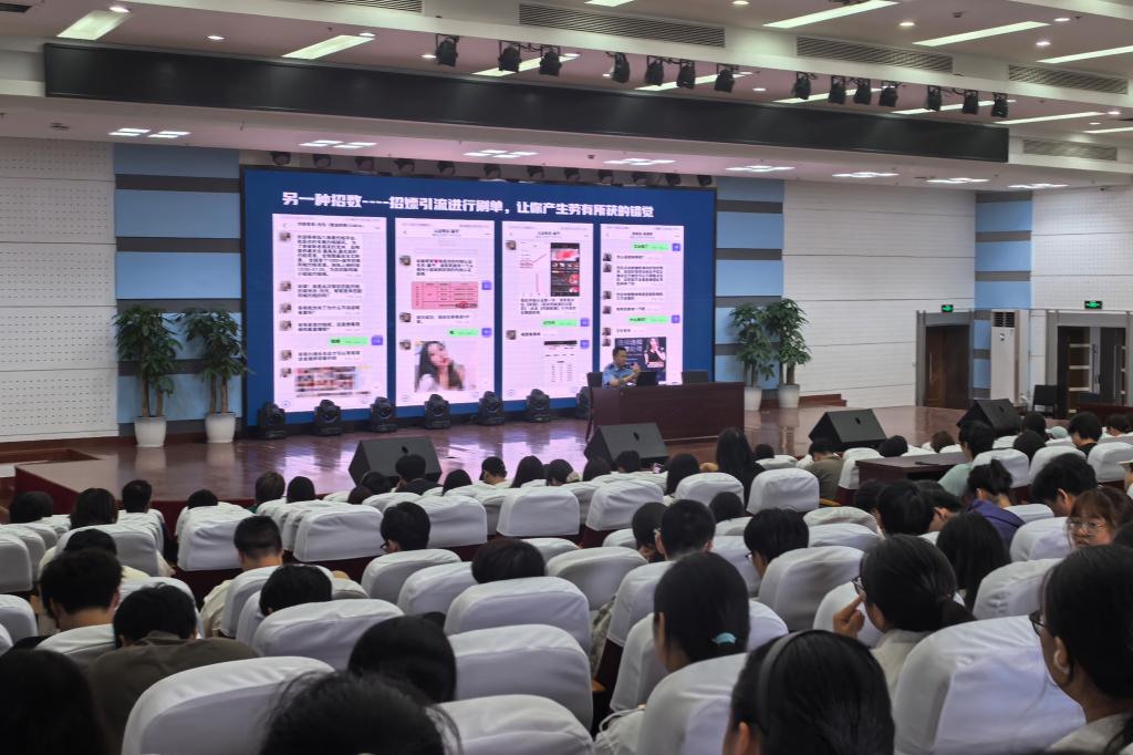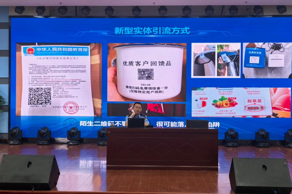 王恒逸警官详细介绍了易受骗人群的类型特点,并展示了过去一年新城区域的发案类型比例。他以时下最新案例为切入点,深入剖析了学生群体常见的被诈骗类型,如兼职刷单返利诈骗、虚拟游戏交易诈骗、网络招嫖诈骗、网络购物诈骗、虚拟客服诈骗等。这些案例真实且令人警醒,引发了师生们的强烈反响和热烈讨论,使反诈意识充分入脑入心。