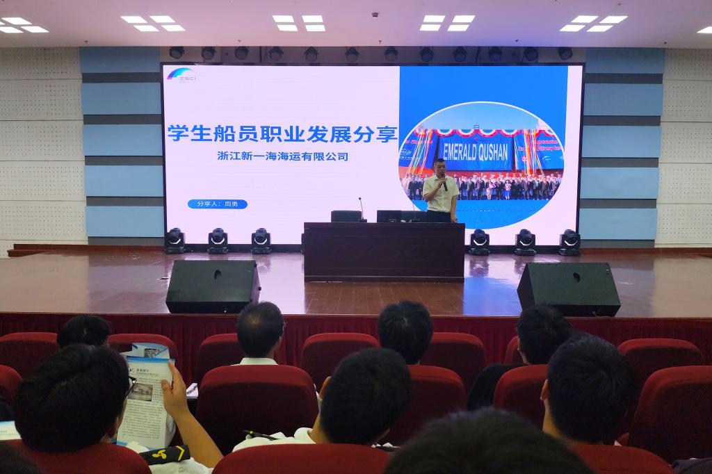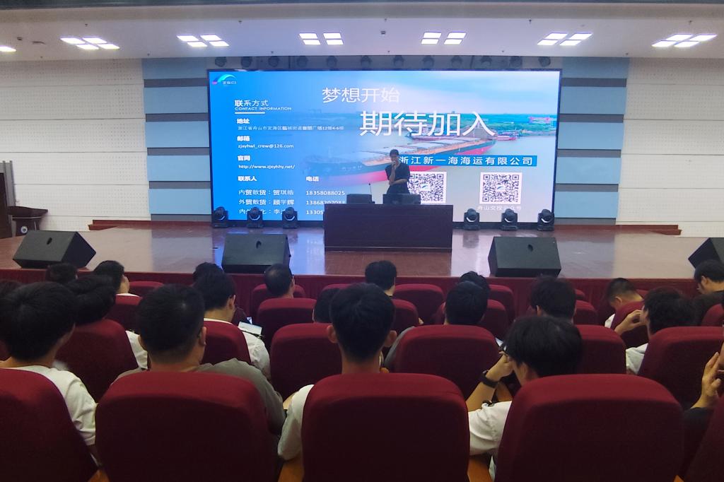 作为舟山市连续三年蝉联“航运龙头企业”的浙江新一海海运有限公司,公司党委委员、纪委书记、工会主席周勇在宣讲介绍了企业的雄厚实力:截至2025年9月,该公司总资产36.86亿,净资产11.78亿元,有员工813人,拥有各类船舶30艘,总运力约129万载重吨。他结合行业发展趋势,为学生勾勒出清晰的职业发展路径——从实习生到高级船员的晋升通道,以及国际化视野培养计划,强调公司“以人为本”的企业文化和“船员利益优先”的管理理念。