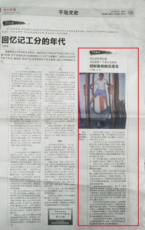 元宝石的主人,是一位80多岁的老大娘,她告诉我,这是他们赵家上代传下来的,算算石器的“年纪”,至少也有200多年历史。“这个老古董是砑布用的”,老太太用的是这个“砑”字,还真是一个专业名词,其含义表示“用卵石或弧形的石块碾压或摩擦皮革、布匹等,使密实而光亮”。