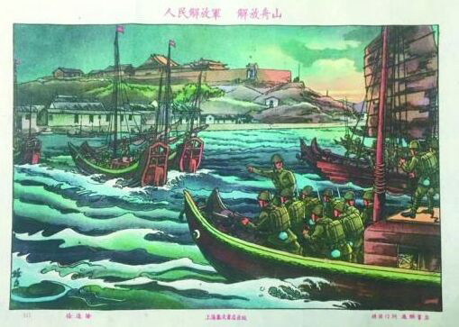 这幅《人民解放军 解放舟山》绘画作品,是上个世纪50年代初的宣传画,作者徐进,是上海广告美术领域的元老级人物,他也编过很多美术教育普及读物。这一幅作品,再现了1950年人民解放军千帆渡海解放舟山的情景,作品中的定海东岳宫山地标十分醒目。