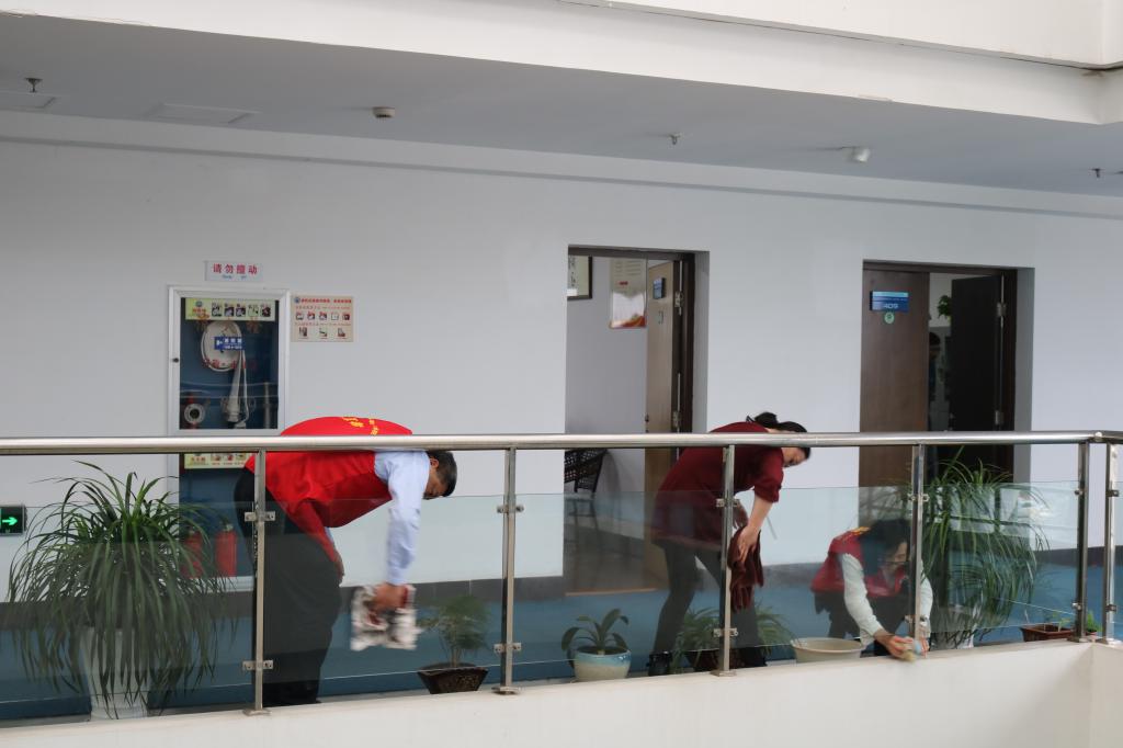 随后,党员志愿者们分工明确,按照各支部的责任区域,拿着抹布、报纸等工具,对行政楼内扶手、窗台、消防设施、及宣传栏窗等进行清洁整理。经过一下午的辛勤劳动,行政楼内窗明几净,环境更加整洁。