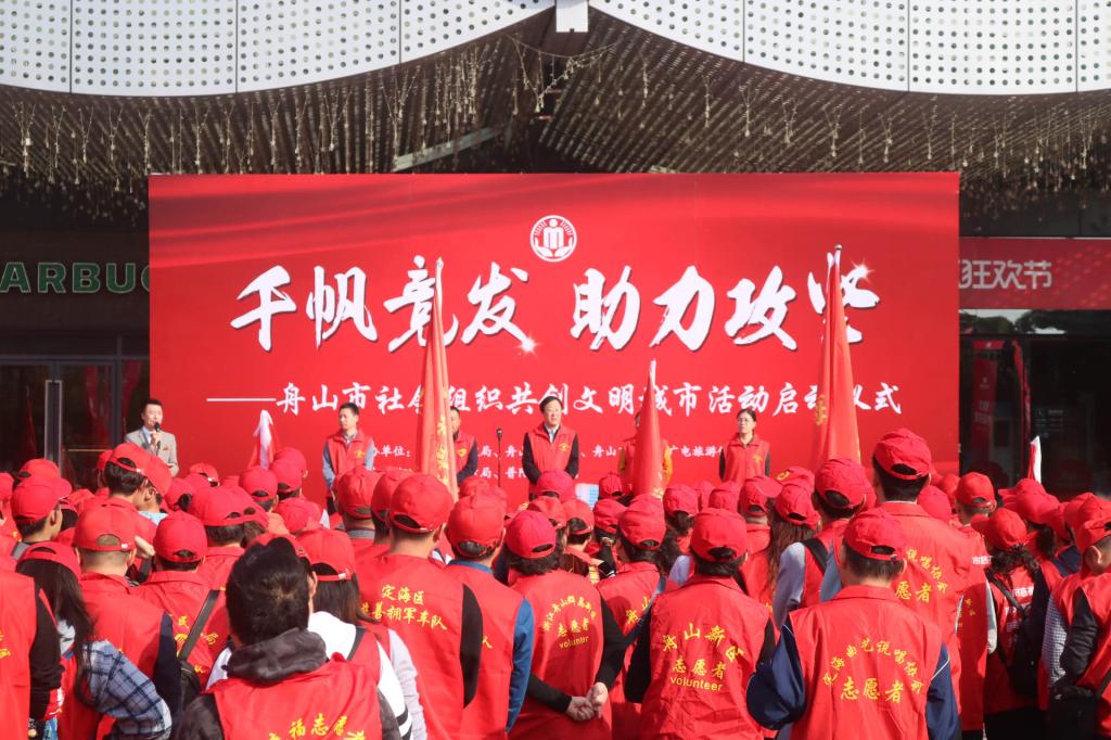 11月2日上午,船舶工程学院“同舟基金”20名志愿者代表来到临城银泰广场,参加了“千帆竞发 助力攻坚”舟山市社会组织共创文明城市活动启动仪式。